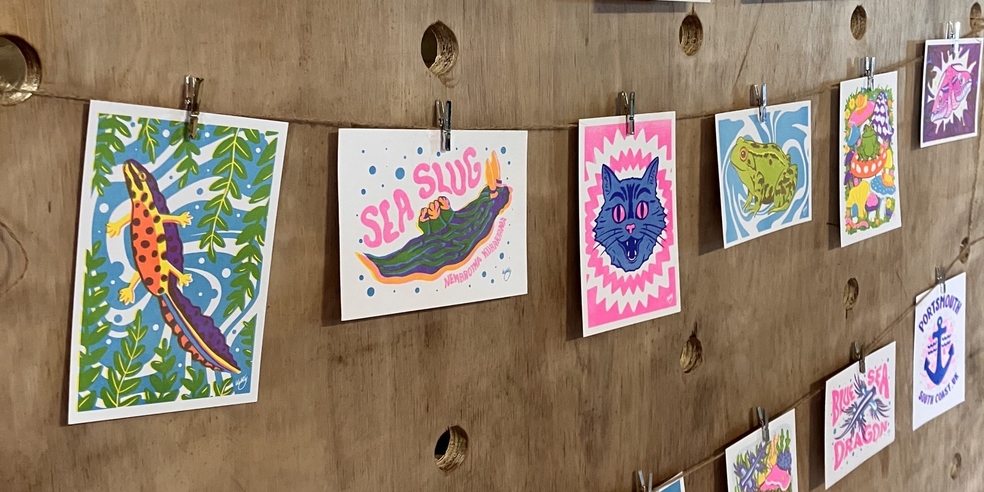 Kitty’s exhibition was a showcase of her colourful nature-inspired work, which she often sells as prints through her business. She also creates 3D puppets and models whilst continuing to experiment with multidisciplinary techniques. Her work is often displayed in small businesses and markets in the local area.