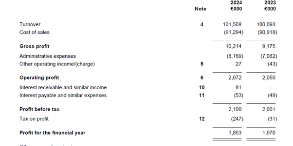 In its results for the financial year ended 31 March 2024, gross profit margin increased to a strong 10.1% with operating profit holding steady at £2.1m.